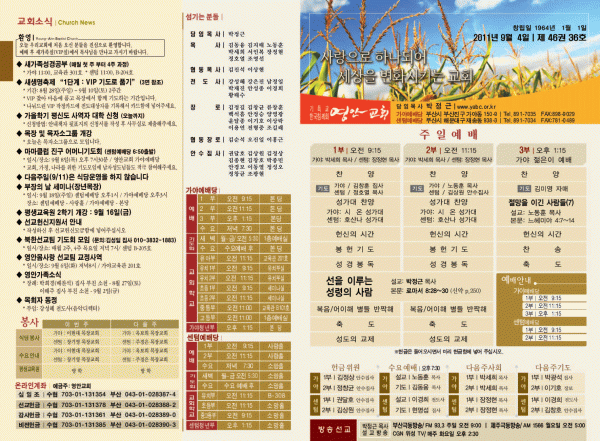 2011년 9월 4일 주보 페이지 정보 작성자 yabc 작성일11-09-03 00:00 조회10,639회 댓글0건 관련링크 목록 본문 2011년 9월 4일 주보 댓글목록 등록된 댓글이 없습니다. 목록