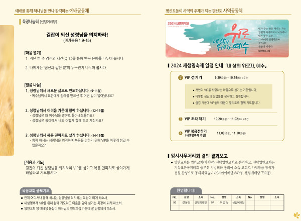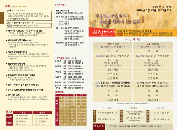 2024년 9월 29일 주보 (센텀예배당) 페이지 정보 작성자 관리지기 작성일24-09-28 10:40 조회2,025회 댓글0건 관련링크 목록 본문 2024년 9월 29일 주보 (센텀예배당) 댓글목록 등록된 댓글이 없습니다. 목록