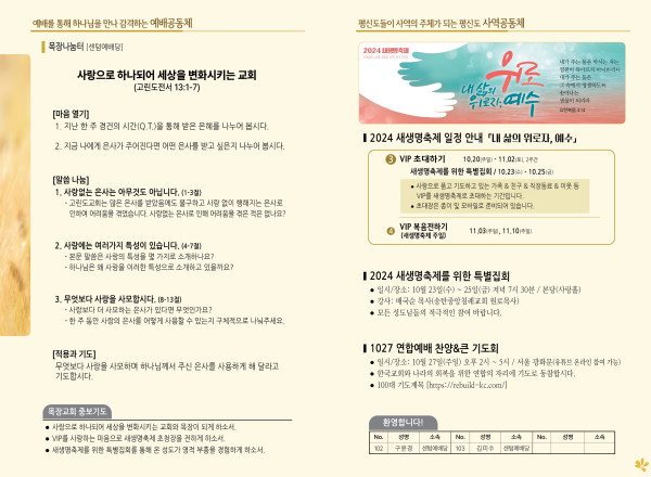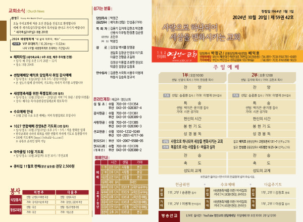 2024년 10월 20일 주보 (센텀예배당) 페이지 정보 작성자 관리지기 작성일24-10-19 10:38 조회2,243회 댓글0건 관련링크 목록 본문 2024년 10월 20일 주보 (센텀예배당) 댓글목록 등록된 댓글이 없습니다. 목록