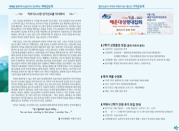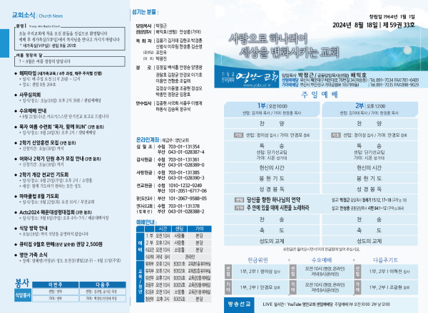 2024년 8월 18일 주보 (센텀예배당) 페이지 정보 작성자 관리지기 작성일24-08-17 10:45 조회2,267회 댓글0건 관련링크 목록 본문 2024년 8월 18일 주보 (센텀예배당) 댓글목록 등록된 댓글이 없습니다. 목록