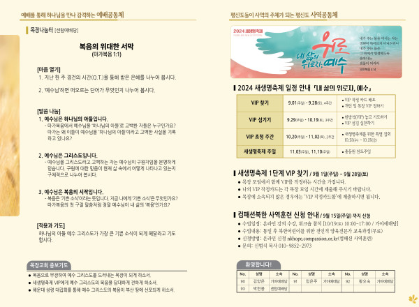 2024년 9월 8일 주보 (센텀예배당) 페이지 정보 작성자 관리지기 작성일24-09-07 11:12 조회2,030회 댓글0건 관련링크 목록 본문 2024년 9월 8일 주보 (센텀예배당) 댓글목록 등록된 댓글이 없습니다. 목록
