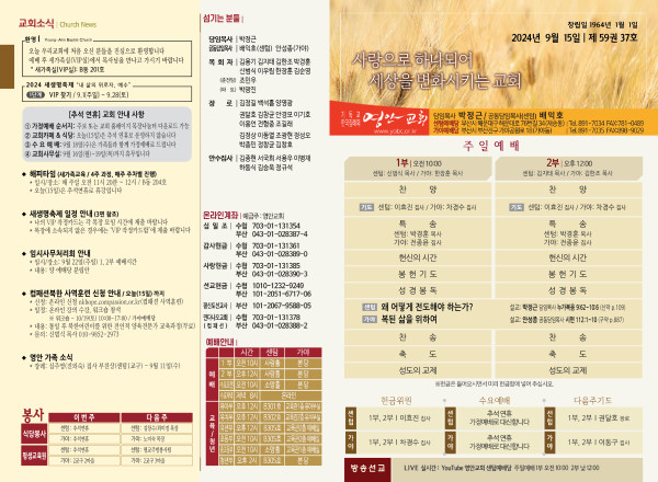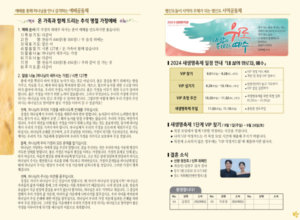 2024년 9월 15일 주보 (센텀예배당) 페이지 정보 작성자 관리지기 작성일24-09-14 10:11 조회2,094회 댓글0건 관련링크 목록 본문 2024년 9월 15일 주보 (센텀예배당) 댓글목록 등록된 댓글이 없습니다. 목록