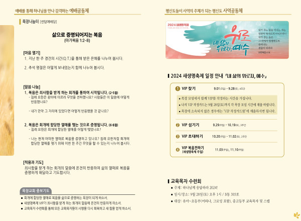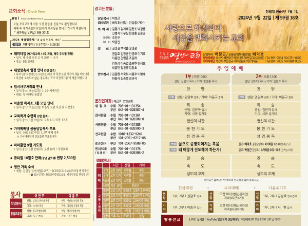 2024년 9월 22일 주보 (센텀예배당) 페이지 정보 작성자 관리지기 작성일24-09-21 10:50 조회2,265회 댓글0건 관련링크 목록 본문 2024년 9월 22일 주보 (센텀예배당) 댓글목록 등록된 댓글이 없습니다. 목록