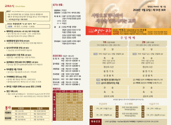 2024년 9월 22일 주보 (가야예배당) 페이지 정보 작성자 관리지기 작성일24-09-21 11:16 조회2,291회 댓글0건 관련링크 목록 본문 2024년 9월 22일 주보 (가야예배당) 댓글목록 등록된 댓글이 없습니다. 목록