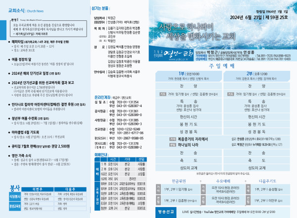2024년 6월 23일 주보 (가야예배당) 페이지 정보 작성자 관리지기 작성일24-06-22 11:10 조회2,555회 댓글0건 관련링크 목록 본문 2024년 6월 23일 주보 (가야예배당) 댓글목록 등록된 댓글이 없습니다. 목록