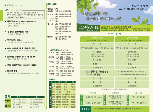 2024년 4월 28일 주보 (가야예배당) 페이지 정보 작성자 관리지기 작성일24-04-27 10:45 조회2,764회 댓글0건 관련링크 목록 본문 2024년 4월 28일 주보 (가야예배당) 댓글목록 등록된 댓글이 없습니다. 목록