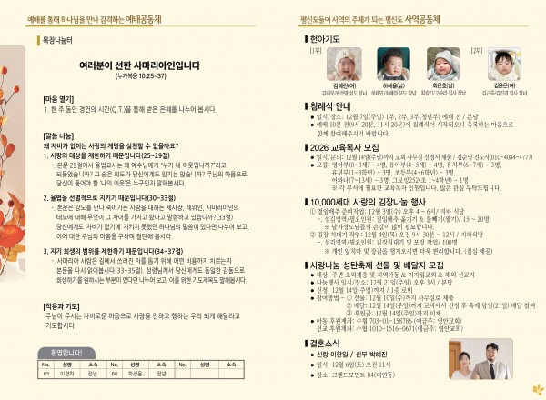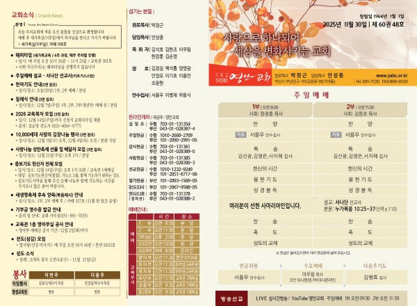 2025년 11월 30일 주보 페이지 정보 작성자 관리지기 작성일25-11-29 10:42 조회713회 댓글0건 관련링크 목록 본문 2025년 11월 30일 주보 댓글목록 등록된 댓글이 없습니다. 목록