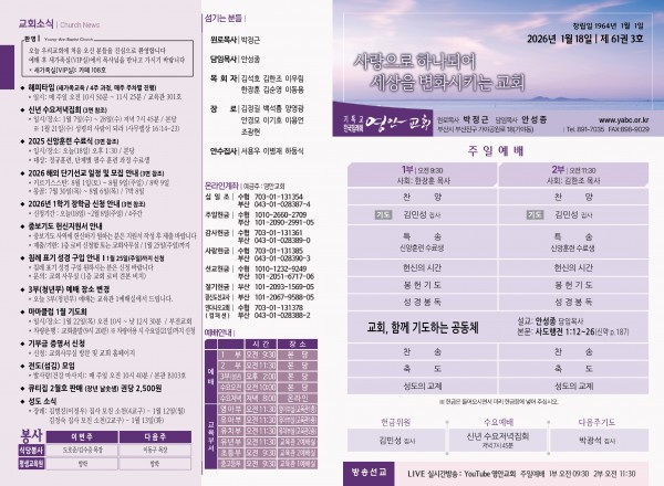2026년 1월 18일 주보 페이지 정보 작성자 관리지기 작성일26-01-17 12:23 조회702회 댓글0건 관련링크 목록 본문 2026년 1월 18일 주보 댓글목록 등록된 댓글이 없습니다. 목록