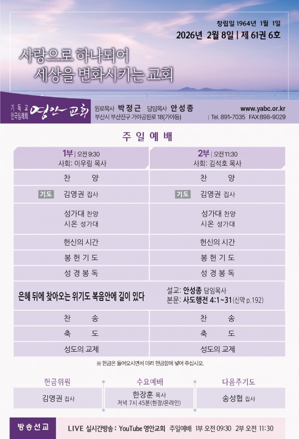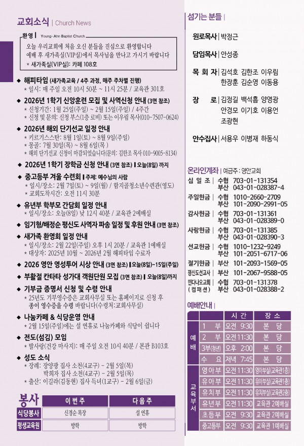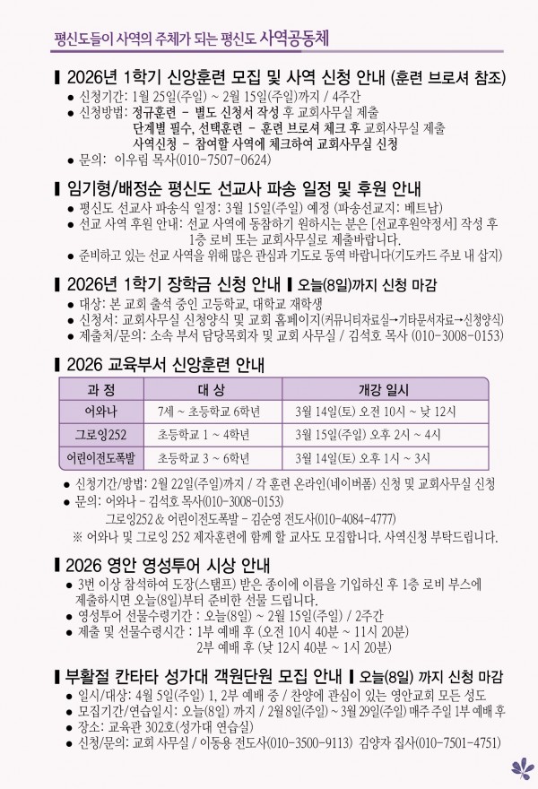 2026년 2월 8일 주보 페이지 정보 작성자 관리지기 작성일26-02-07 11:08 조회641회 댓글0건 관련링크 목록 본문 2026년 2월 8일 주보 댓글목록 등록된 댓글이 없습니다. 목록